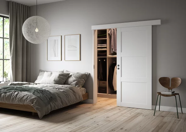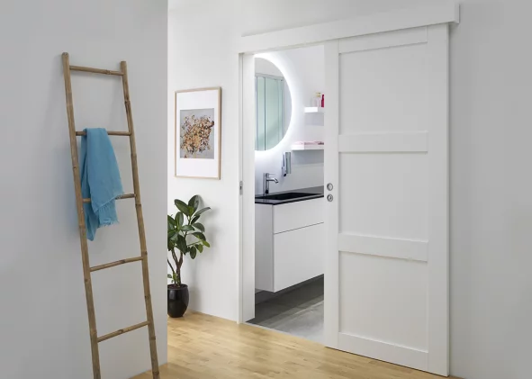Til de fleste boliger anbefales en skydedør monteret uden på væggen, fordi den: