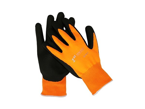 OS arbejdshandske af tynd nylonstrik med ribkrave i Hi-Viz orange farve. Håndfladebelægning af opskummet nitril. Handsken er "Touch-skærm" følsom i tre fingre.