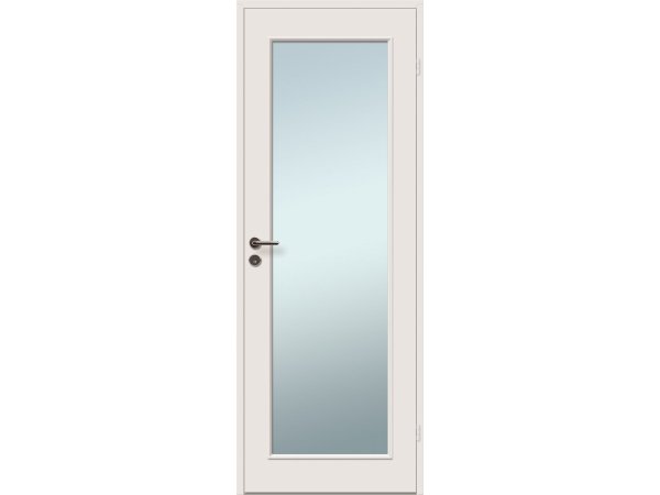 Høgild celledør 1 glasfelt og malet overflade (top og bund) i hvid NCS S0502-Y med glans 25. Døren er velegnet til brug i ventilerede og opvarmede lokaler og har en celle-struktur med ramme i MDF. Den er udstyret med 4 mm klart hærdet glas og hvide snap-in hængsler, model 6540.