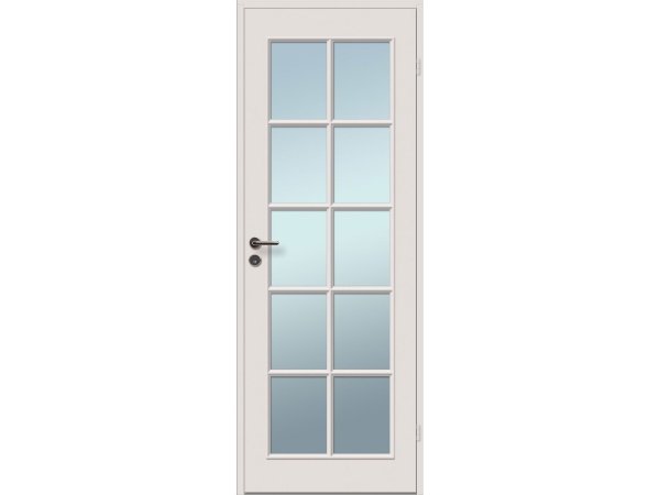 Høgild celledør 10 glasfelter og malet overflade (top og bund) i hvid NCS S0502-Y med glans 25. Døren er velegnet til brug i ventilerede og opvarmede lokaler og har en celle-struktur med ramme i MDF. Den er udstyret med 4 mm klart hærdet glas og hvide snap-in hængsler, model 6540.