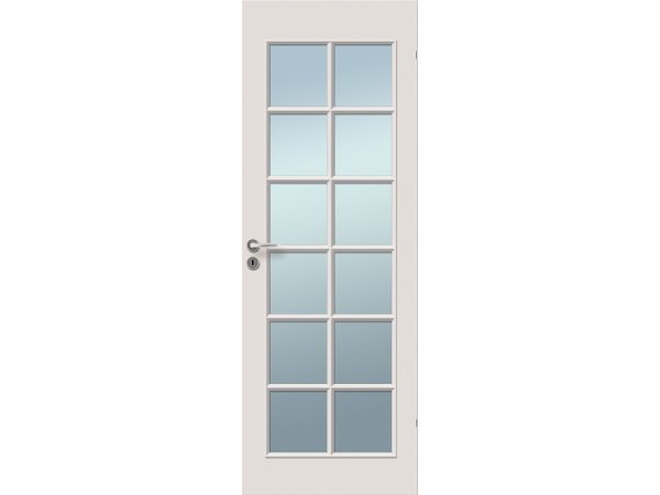 Høgild celledør 12 glasfelter og malet overflade (top og bund) i hvid NCS S0502-Y med glans 25. Døren er velegnet til brug i ventilerede og opvarmede lokaler og har en celle-struktur med ramme i MDF. Den er udstyret med 4 mm klart hærdet glas og hvide snap-in hængsler, model 6540.