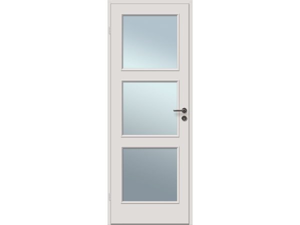 Høgild glat massivdør 3/1 glasfelt med malet overflade (top og bund) i hvid NCS S0502-Y, glans 25. Døren er beregnet til brug i ventilerede og opvarmede lokaler og har en sandwichkonstruktion af spånplade med integrerede lydkanaler. Den leveres med hvide snap-in hængsler, model 6540, og er FSC Mix 70%-certificeret.