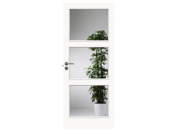 Swedoors Stable GW3 massiv glasdør 725x2040x40 mm hvid er en moderne formpresset glasdør til indendørs montering. En elsket klassiker der passer til indretningen i de fleste hjem. Glasdøren er udstyret med 3 glasfelter i hærdet glas. Døren er vendbar, hvorfor du ikke skal tage stilling til hvilken side døren skal være hængslet i.