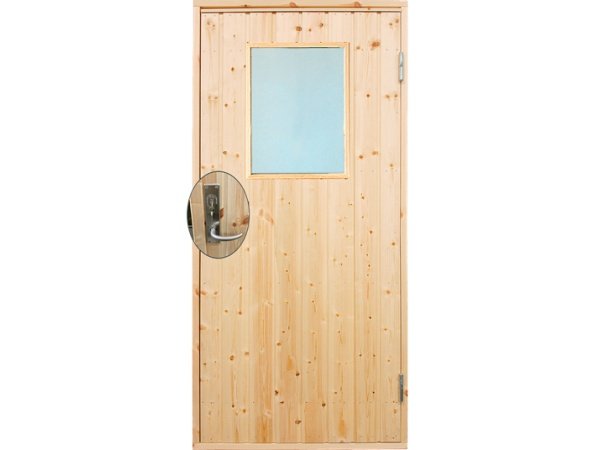 Plus udhusdør std. panel m/vindue, inkl. karm (393530-1). Udhusdøren er af høj skandinavisk kvalitet, og den er velegnet til uopvarmede rum med ingen eller begrænset temperaturforskel mellem inde og ude på max. 10 gr. forskel, eksempelvis et redskabsrum. Udhusdøren leveres i ubehandlet sporet plywood, og skal derfor efterbehandles både inde- og udvendigt inden montering af døren. Døren skal være tør, ren og fri for støv, hvorefter den kan behandles med træbeskyttelse - såfremt døren males mørkere end NCS 7500-N (Antrazitgrå) ydes ingen garanti for dørens formstabilitet. Gentag efterbehandling årligt eller efter behov.