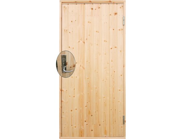 Plus udhusdør std. panel, inkl. karm (393510-1). Udhusdøren er af høj skandinavisk kvalitet, og den er velegnet til uopvarmede rum med ingen eller begrænset temperaturforskel mellem inde og ude på max. 10 gr. forskel, eksempelvis et redskabsrum. Udhusdøren leveres i ubehandlet sporet plywood, og skal derfor efterbehandles både inde- og udvendigt inden montering af døren. Døren skal være tør, ren og fri for støv, hvorefter den kan behandles med træbeskyttelse - såfremt døren males mørkere end NCS 7500-N (Antrazitgrå) ydes ingen garanti for dørens formstabilitet. Gentag efterbehandling årligt eller efter behov.