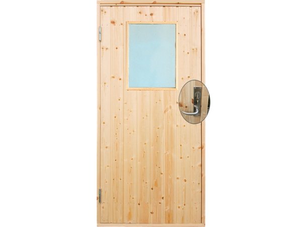 Plus udhusdør std. panel m/vindue, inkl. karm (393520-1). Udhusdøren er af høj skandinavisk kvalitet, og den er velegnet til uopvarmede rum med ingen eller begrænset temperaturforskel mellem inde og ude på max. 10 gr. forskel, eksempelvis et redskabsrum. Udhusdøren leveres i ubehandlet sporet plywood, og skal derfor efterbehandles både inde- og udvendigt inden montering af døren. Døren skal være tør, ren og fri for støv, hvorefter den kan behandles med træbeskyttelse - såfremt døren males mørkere end NCS 7500-N (Antrazitgrå) ydes ingen garanti for dørens formstabilitet. Gentag efterbehandling årligt eller efter behov.
