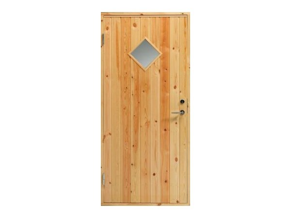 Swedoor udhusdør med glas 948x2050x92 mm venstre i ubehandlet fyr med lodrette spor er perfekt til fx udhuset, cykelskuret eller jagthytten. Udhusdøren er beklædt med klassisk rustik fyr, som skal efterbehandles inden montering. Døren er med meget enkel isolering og skal kun anvendes til uopvarmede rum med ingen eller begrænset temperaturforskel mellem inde og ude. Typisk ikke mere end -/+ 3 grader. Udhusdøren leveres altid hængt i karm, dog uden dørgreb og cylinder. Bemærk: Swedoor/Jeld-wen udhusdør leveres i ubehandlet fyrretræ. For at sikre den nye udhusdør et langt og godt liv, anbefaler Swedoor Jeld-Wen at male døren med en heldækkende olie- eller vandbaseret maling til udendørs brug. Undgå klar lak, da det giver en dårlig beskyttelse og kan forårsage sprækkedannelser i træet. Udhusdøren skal males på begge sider ca. hvert andet år, eller som minimum inden vand og sol nedbryder overfladen.