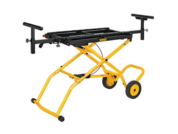 Dewalt stander DE7260-XJ/arbejdsstation til kap-/geringssave. Bordet er nemt at transportere, både når det er klappet sammen, og når det er slået ud, da det kører på gummihjul. Det har to højdejusteringer, så du kan få den bedste arbejdsposition, og kan rumme materialer på op til 2,4 m.