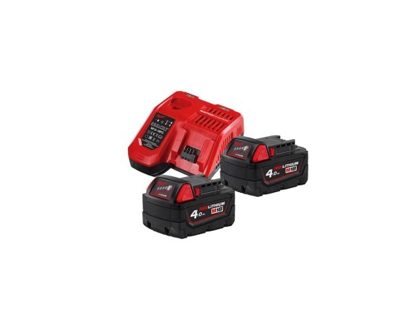 Milwaukee M18 batterisæt M18 NRG-402 består af 2 x M18 B4 4,0 Ah batterier og 1x M12-18 C lader.