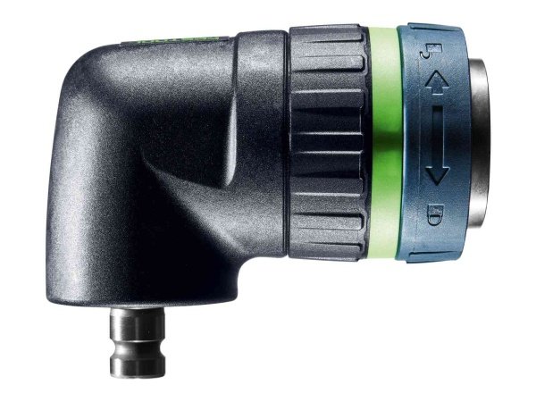 Festool vinkelforsats sikrer hurtig og enkel vinkelindstilling ved at dreje på den grønne ring - forsatsen behøver ikke længere at løsnes fra maskinen. Vinkelforsatsen sikrer boring og skruening tæt på kanten.