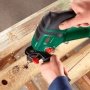Bosch Universal borehammer gør det sjovt at bore takket være kombinationen af stor slagkraft, nem håndtering og fleksibilitet. Det er udstyret med en pneumatisk Bosch-slagmekanisme på 2,0 J, der er ideel til boring af huller op til ∅ 16 mm i beton med et SDS plus-bor. Den imponerende kraft kan også bruges til fjernelse af vægklinker og mejsling af kabelkanaler. Gør-det-selv-entusiaster vil sætte pris på den lette, kompakte hammerstørrelse, der gør arbejdet mindre trættende. Desuden sikrer vibrations- og rotationsstyringen, at værktøjet ryster mindre og er mere stabilt.
