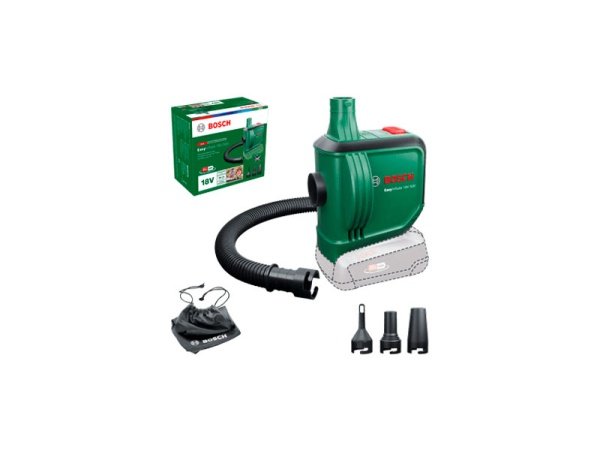 Bosch EasyInflate 18V-500 er en alsidig og effektiv batteridrevet luftpumpe, der gør oppustning og tømning af luftmadrasser, badebassiner og lignende både hurtig og enkel. Den kompakte størrelse og håndfri funktion gør den nem at bruge og transportere. Med en luftgennemstrømning på 530 liter pr. minut kan du hurtigt fylde selv store genstande. Pumpen er en del af Bosch POWER FOR ALL-systemet, hvilket betyder, at den kan anvendes med eksisterende 18V Bosch-batterier. Lader og batteri medfølger ikke.