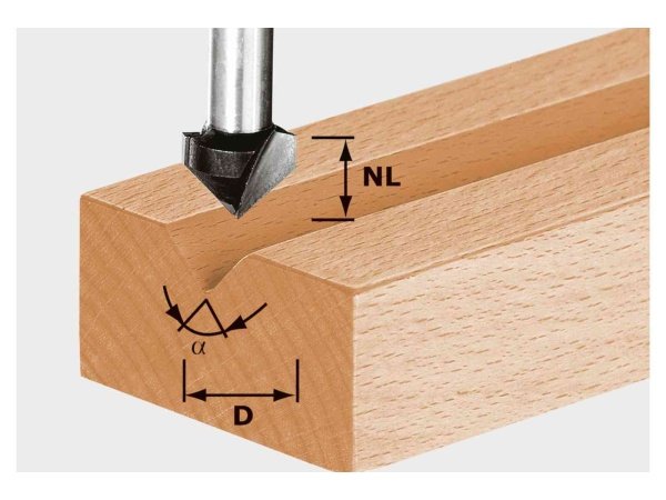 Festool v-notfræser HS S8 D14/7/90grad 490998. V-notfræser til overfræser, der fås i 2 forskellige vinkler, til fremstilling af pyntenoter.