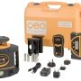 Rotationslaseren leveres med modtager FR 77, fjernbetjening, væg/loft beslag, magnetisk måltavle, batterirum til Alkaline, laserbriller, oplader.