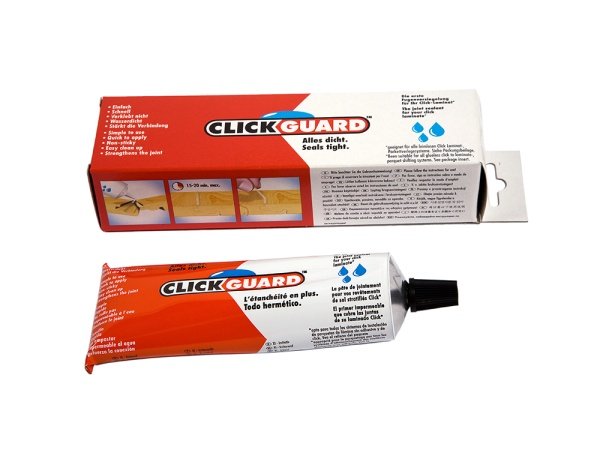 Wallmann Click Guard forsegler bruges til forsegling af samlinger og forhindrer at fugt trænger ned i revnen mellem to paneler. Det er ikke en lim og det hærder ikke op, men er fleksibel så det kan “bevæge sig” sammen med gulvet.
