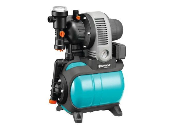 Gardena Comfort husvandværk 1753-20, 3000/4 eco (967245901). Med dette husvandværk får du fuldautomatisk fordeling af billigt regnvand, eksempelvis fra regntønder, brønde eller cisterner, så du kan bruge vandet til toiletskyl, til vaskemaskinen eller til vanding af haven. Husvandværket slukker og tænder automatisk afhængigt af vandbehovet, så det arbejder ekstremt billigt. Den rummelige 24 liters tank er vedligeholdelsesfri i fem år. Det betyder. at du i løbet af de fem år ikke behøver skifte membranen, og der skal ikke fyldes mere luft på. Husvandværket er udstyret med et indbygget forfilter, der beskytter pumpen mod sand og andre urenheder, samt en tilbagestrømsspærring, så den er meget nem at sætte i drift, at slukke og at sætte på "manuel" eller "automatisk" drift ved hjælp af multifunktionsdrejeknappen. Manometeret og pressostaten er integreret i konstruktionen, så det ikke optager ekstra plads. Husvandværket overbeviser på grund af den veludførte teknologi, topkvalitet i alle materialer og det pladsbesparende design.