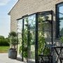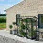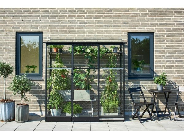 Halls Qube Lean-To 26 1,2 m² drivhus med 3 mm hærdet glas og sorte profiler. Halls Qube Lean-To drivhus monteres op ad husmuren, udhuset eller lignende. Det kunne f.eks. være på terrassen. Fordelen ved montering op ad husmuren er, at husmuren bliver opvarmet i løbet af dagen, så muren vil afgive denne varme til drivhuset om natten, så du opnår gode vækstbetingelser for dine planter.