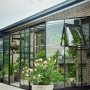 Halls Qube Lean-To 612 7,1 m² drivhus med 3 mm hærdet glas og sorte profiler. Halls Qube Lean-To drivhus monteres op ad husmuren, udhuset eller lignende. Det kunne f.eks. være på terrassen. Fordelen ved montering op ad husmuren er, at husmuren bliver opvarmet i løbet af dagen, så muren vil afgive denne varme til drivhuset om natten, så du opnår gode vækstbetingelser for dine planter.