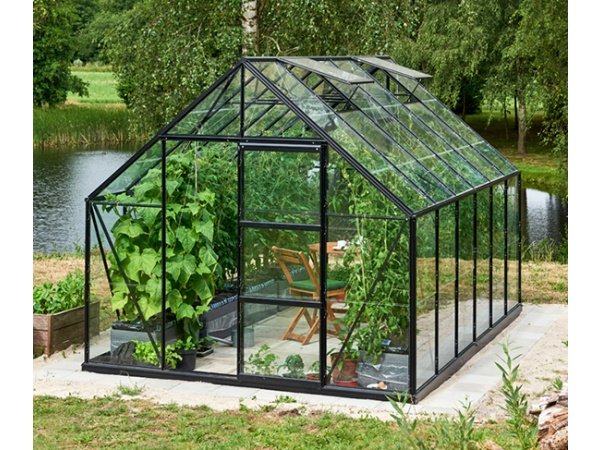 Halls Universal 128 9,9 m² drivhus med 3 mm hærdet glas og sorte profiler er et diamantformet drivhus med en meget kraftig konstruktion. Halls Universal drivhus har et meget klassisk design tilsat nogle meget lækre detaljer. Det er et meget praktisk og stabilt drivhus. Alt i alt får du her et meget rummeligt drivhus med en højde på over 2 meter, så du har rig mulighed for at lade kreativiteten få frit løb.