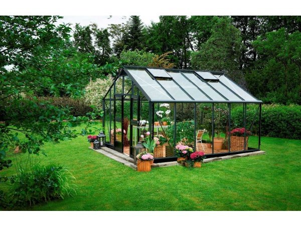 Juliana Gartner drivhus 16,2 m2 med 3 mm hærdet glas og antracitgrå profiler model F09496 er en del af Gartner-serien, som er velegnede til dem, der gerne vil have god plads. Hvad enten du er drivhusentusiaster, der vil gro og dyrke, eller blot typen, der søger dejligt uderum i haven, så dækker Juliana Gartner behovet. Den ekstra store sidehøjde på 172 cm og totalhøjden på 287 cm (begge mål inklusiv 12 cm stålfundament) giver en god rumfornemmelse og gode arbejdsforhold.