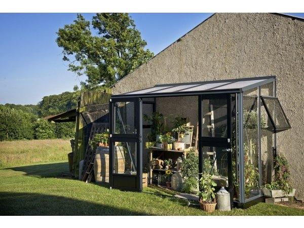 Juliana Veranda 4,4 m2 med 3 mm hærdet glas (F09606) er et drivhus i farven antracit/sort. Drivhuset kan stilles op ad en husmur, hvilket gør at begge dele bliver opvarmet i løbet af dagen. Med de dobbelte stalddøre i fronten af drivhuset, har du nem adgang til drivhuset. Drivhuset er på grund af højden rummelig og der er dermed plads til dine grøntsager og planter.