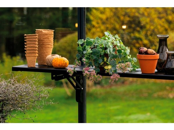 Halls integreret lamelhylde er en smart og pladsbesparende løsning til drivhuset, garagen, udekøkkenet eller andre steder, hvor du har brug for ekstra opbevaring. Hylden udnytter pladsen optimalt og kan monteres både i gavlen og langs sidevæggen. Når planterne vokser i højden, klappes hylden blot ned, så du får mere fri plads omkring tomater, agurker og andre høje afgrøder.