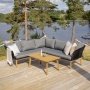 Venture Design loungesæt Chania er en trendy moderne sofagruppe med fokus på komfort. Sofagruppen består af en sofagruppe med fire sæder og en hjørnesektion inklusiv mørkegrå hynder. Loungesættet indeholder desuden også et lavt bord i akacietræ hvilket sammen med hjørnesofaen er med til at skabe en eksklusiv helhedsfølelse.