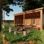Plus Nordic Bålhytte 9,5 m2 Type 1C i ubehandlet nåletræ med tre lukkede sider og indbygget bænk, hvor du kan samle familie og venner.