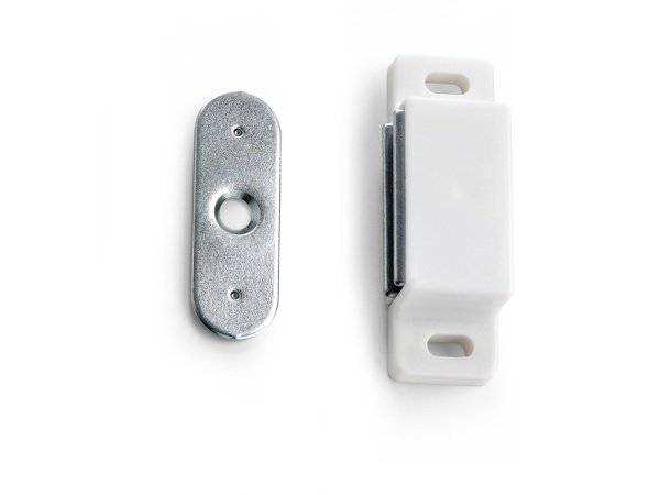 Magnetlås i hvid plast og metal. Kan monteres som skabslås på f.eks. køkkenlågerne eller andre skabslåger, hvor du ønsker en mere kraftig magnetlås.