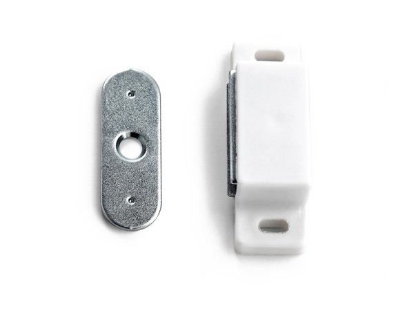 Magnetlås i hvid plast og metal. Kan monteres som skabslås på f.eks. køkkenlågerne eller andre skabslåger, hvor du ønsker en mere kraftig magnetlås.