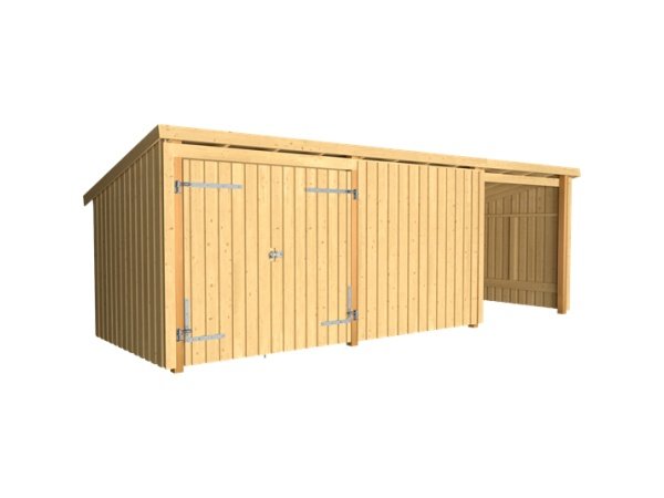 Plus Nordic Multi 3 havehus 635x218x167x218 cm med dobbeltdør samt én lukket og én åben front. Det store Plus Nordic Multihus 3 giver dig utroligt mange anvendelsesmuligheder som f.eks. cykelskur, brændeskur, opbevaringsskur og meget mere. Plus Nordic Multi havehus leveres som "saml-selv" i ubehandlet træ, og det anbefales, at du behandler træet før opsætning.