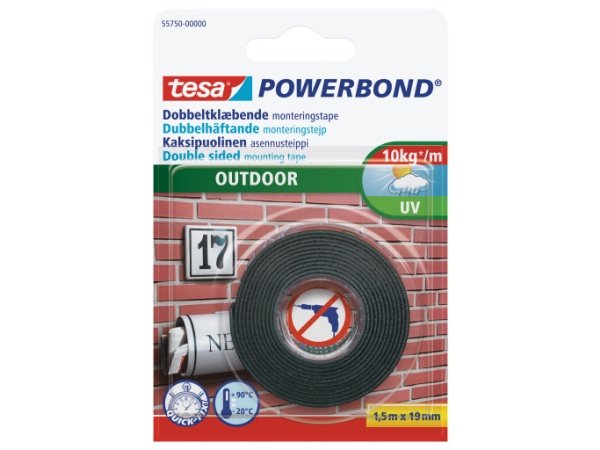 Tesa Powerbond Dobbeltklæbende Monteringstape Outdoor (55750) er den sikre vejrbestandige, dobbeltklæbende monteringstape til en lang række opgaver udendørs. Kan bruges til flade genstande op til 10 mm tykkelse og på de fleste glatte, tilstrækkeligt hårde overflader.