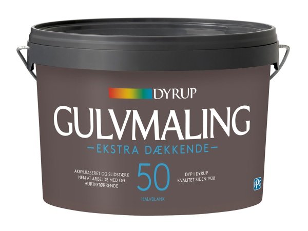 Dyrup Gulvmaling Ekstra Dækkende Vand 50 er en acrylmaling til træ- og betongulve. Malingen giver et meget slidstærkt gulv med en hård, halvblank overflade, der er nem at rengøre. Malingen er nem at arbejde med og er berøringstør efter blot en time.