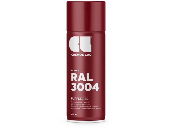 Højkvalitets spraymaling fra Cosmos LAC serien RAL i farven 3004 Purple Red med en flot, højglans finish. Malingen er baseret på 100 % akryl og er udviklet til både professionelle og gør-det-selv projekter, hvor der stilles krav til holdbarhed, farvenøjagtighed og hurtig tørretid.