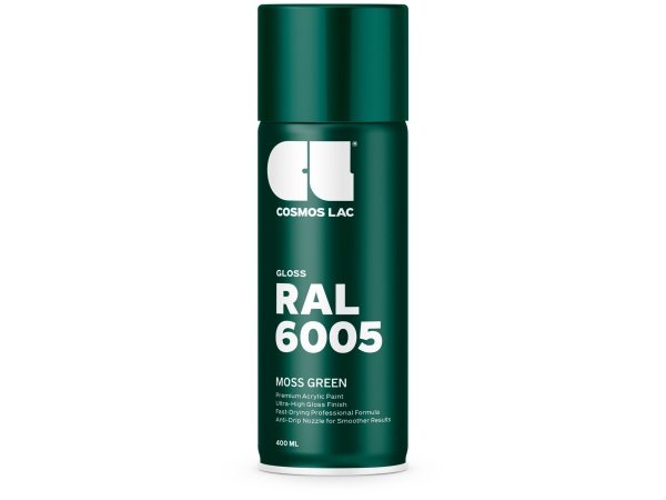 Højkvalitets spraymaling fra Cosmos LAC serien RAL i farven 6005 Moss Green med en flot, højglans finish. Malingen er baseret på 100 % akryl og er udviklet til både professionelle og gør-det-selv projekter, hvor der stilles krav til holdbarhed, farvenøjagtighed og hurtig tørretid.
