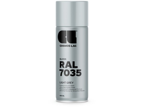 Højkvalitets spraymaling fra Cosmos LAC serien RAL i farven 7035 Light Grey med en flot, højglans finish. Malingen er baseret på 100 % akryl og er udviklet til både professionelle og gør-det-selv projekter, hvor der stilles krav til holdbarhed, farvenøjagtighed og hurtig tørretid.