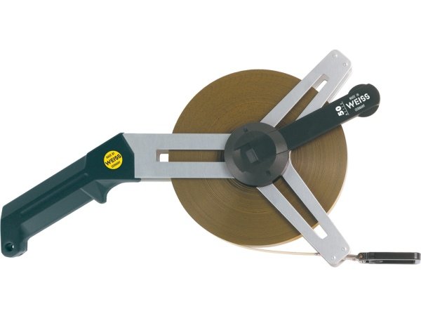 Weiss båndmål 50 meter er et gaffelbåndmål i stål med en udklappelig krog, så den kan holde sig selv.