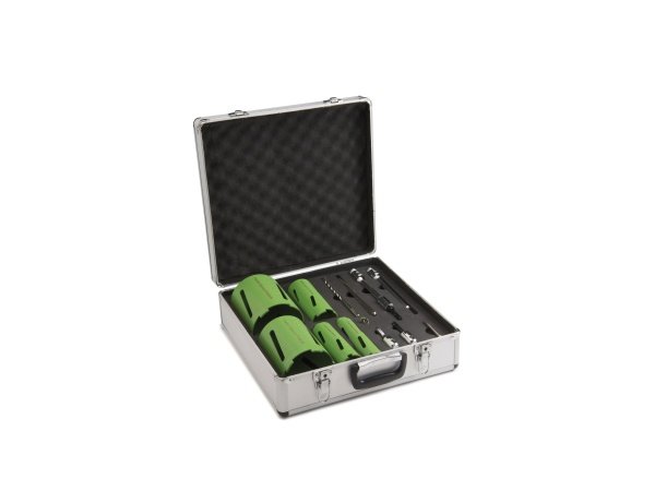 ST-CD-5 diamant kerneboresæt til tørboring. Sættet består af 5 stk. tør- diamantbor i størrelse 42, 52, 65, 117 og 127 mm og 7 stk. tilbehør, chuck og SDS-adaptere, chuck og SDS-udvidelser, A-koniske borekroner og styrestang og driftstast. N.B. kerneborene er P4 DC-produkter.