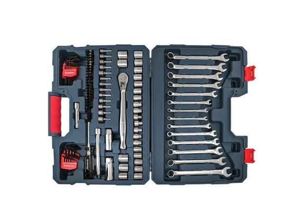 Sættet består af tændrørstoppe og toppe 6-19 mm – 3/16”-13/16”, ringgaffelnøgler 6-15 mm – ¼” – 5/8”, stiftnøglesæt, boltbits, bits og holder.