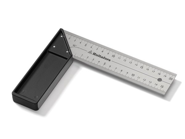 Hultafors tømrervinkel V 20 P med anslag i aluminium og millimetergradering i over- og underkant på klingen. Graderingen er dybtætset, så den er yderst modstandsdygtig overfor slitage.
