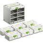 Festool Systainer³-rack er opbygget som en reol i Systainer-format og rummer plads til 6 Mini-Systainere³ S 76, så du kan pakke dine Mini-Systainere ordentligt og desuden transportere dem i bilindretningen bott vario3. Den kan desuden udvides helt efter dine behov for orden og oversigt for mindre Systainere.