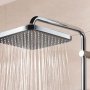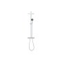 Det vægmonterede brusesystem har en Vitalio Comfort 250 Cube hovedbruser, en Vitalio Start 100 håndbruser, termostat, bruserstang med 390 mm svingbar brusearm og glideelement til justering af håndbruser plus en 1750 mm VitalioFlex Comfort Twistfree slange