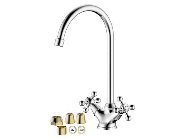Armaturet har to traditionelle greb, som giver sikker og slidstærk kontrol over både koldt og varmt vand. Designdele i gold-look medfølger, hvilket giver mulighed for et personligt og stilfuldt udtryk.