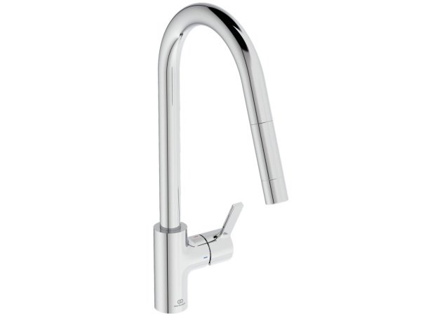 Gusto køkkenarmatur C-tud m/udtræk er fremstillet i et elegant og moderne design, og den er udstyret med FirmaFlow og skjult luftblander.