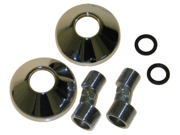 VVS Trading monteringssæt 3/4"x1/2" i krom er et kvalitets monteringssæt til brusearmaturer. Pakken indeholder rosetter og pakninger.